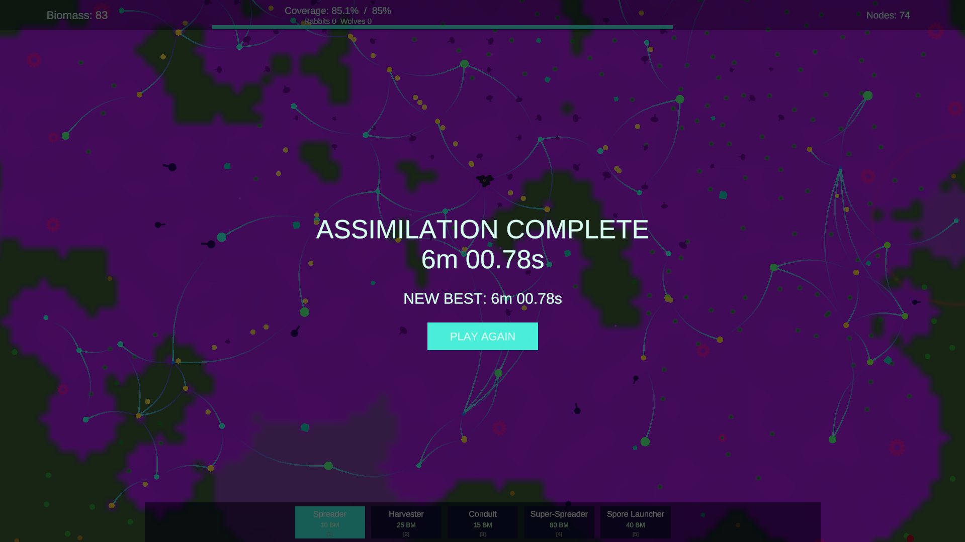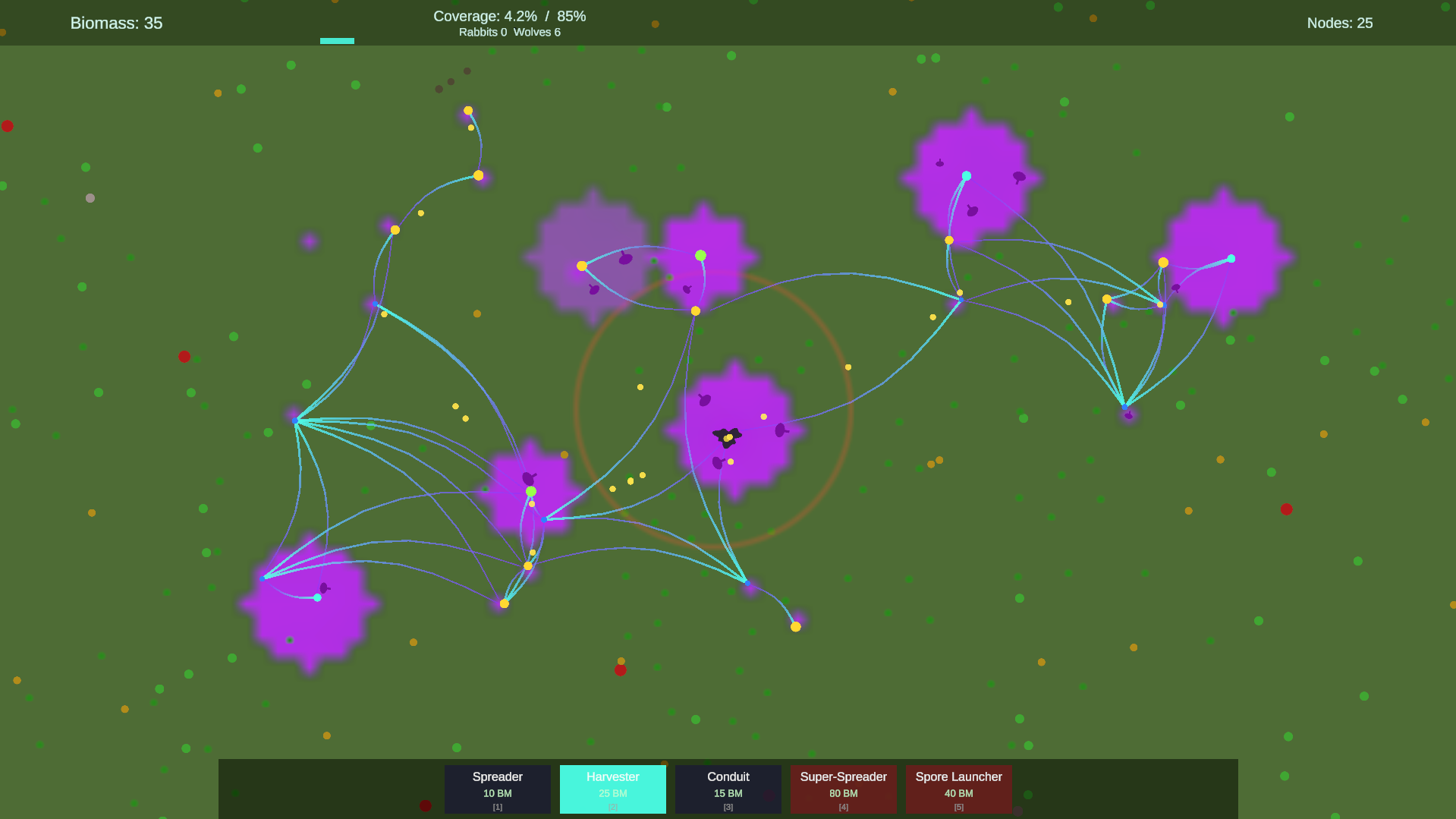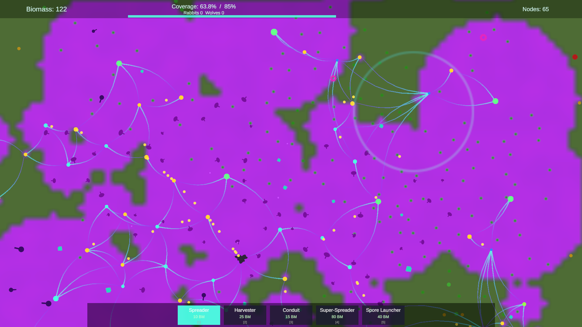 KINGDOM is a short but challenging minimal arcade-ey game where you take over and assimilate an ecosystem as an alien parasite. Currently there are 5 towers you can build and two different enemy types, along with an evolving ecosystem that both you build and destroy each match with increasing enemy waves each time that attack.